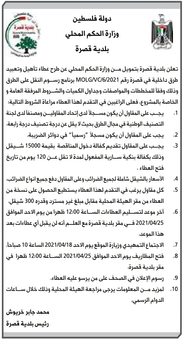 تعلن بلديه قصرة وبتمويل من وزارة الحكم المحلي عن طرح #عطاء_تأهيل_وتعبيد_طرق_داخلية في بلدة قصرة، وذلك…