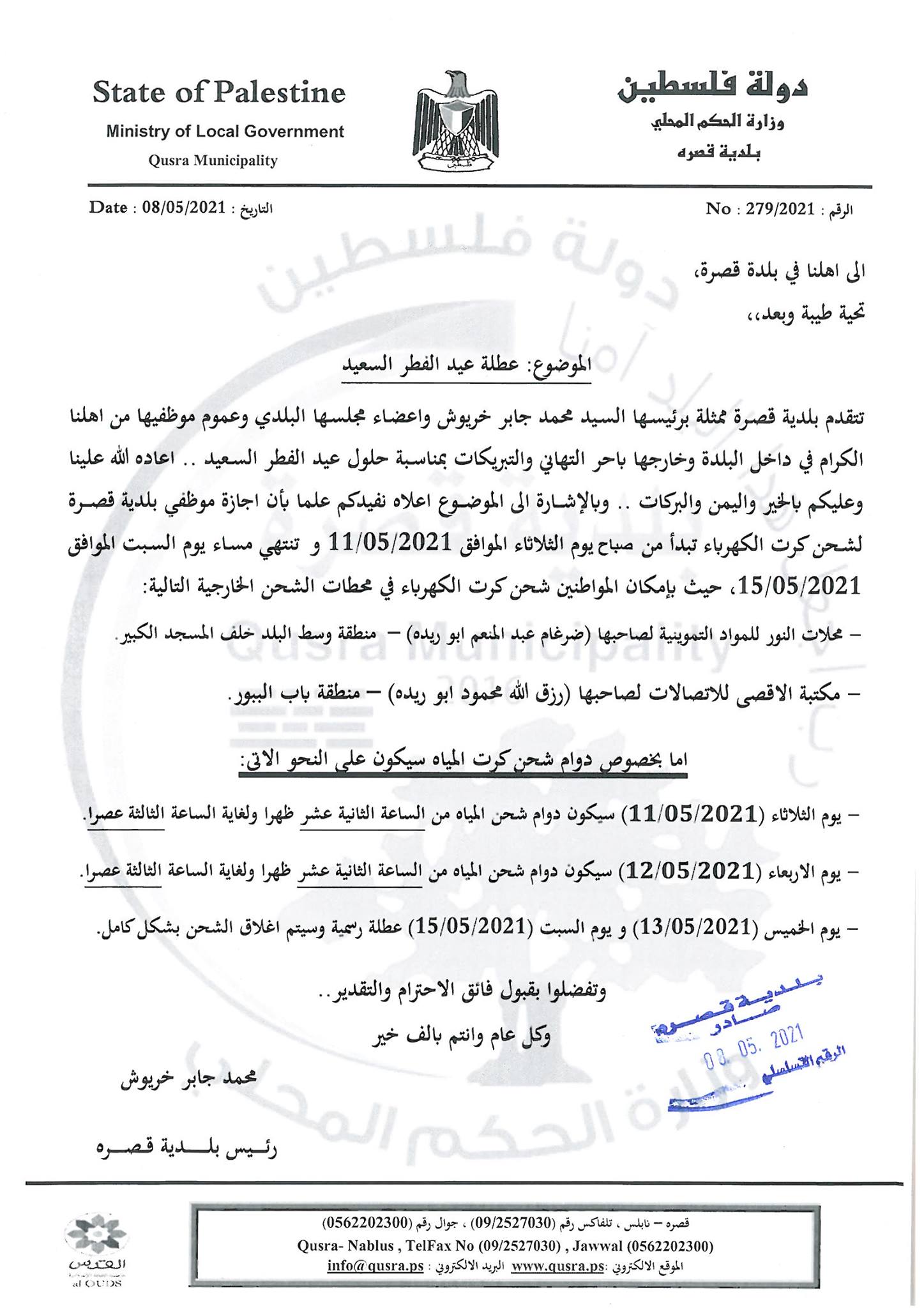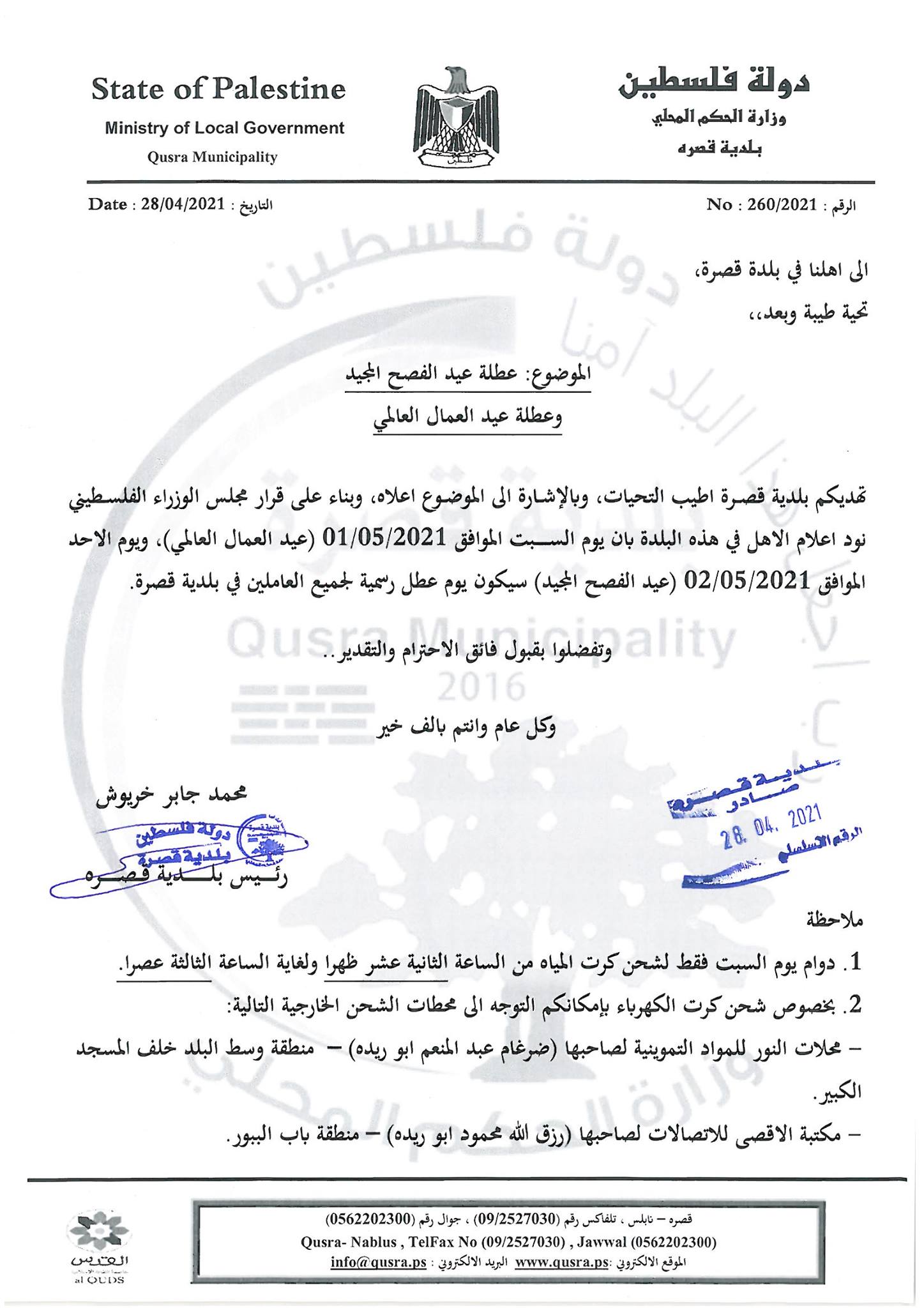 عطلة عيد الفطر السعيد لموظفي بلدية قصره