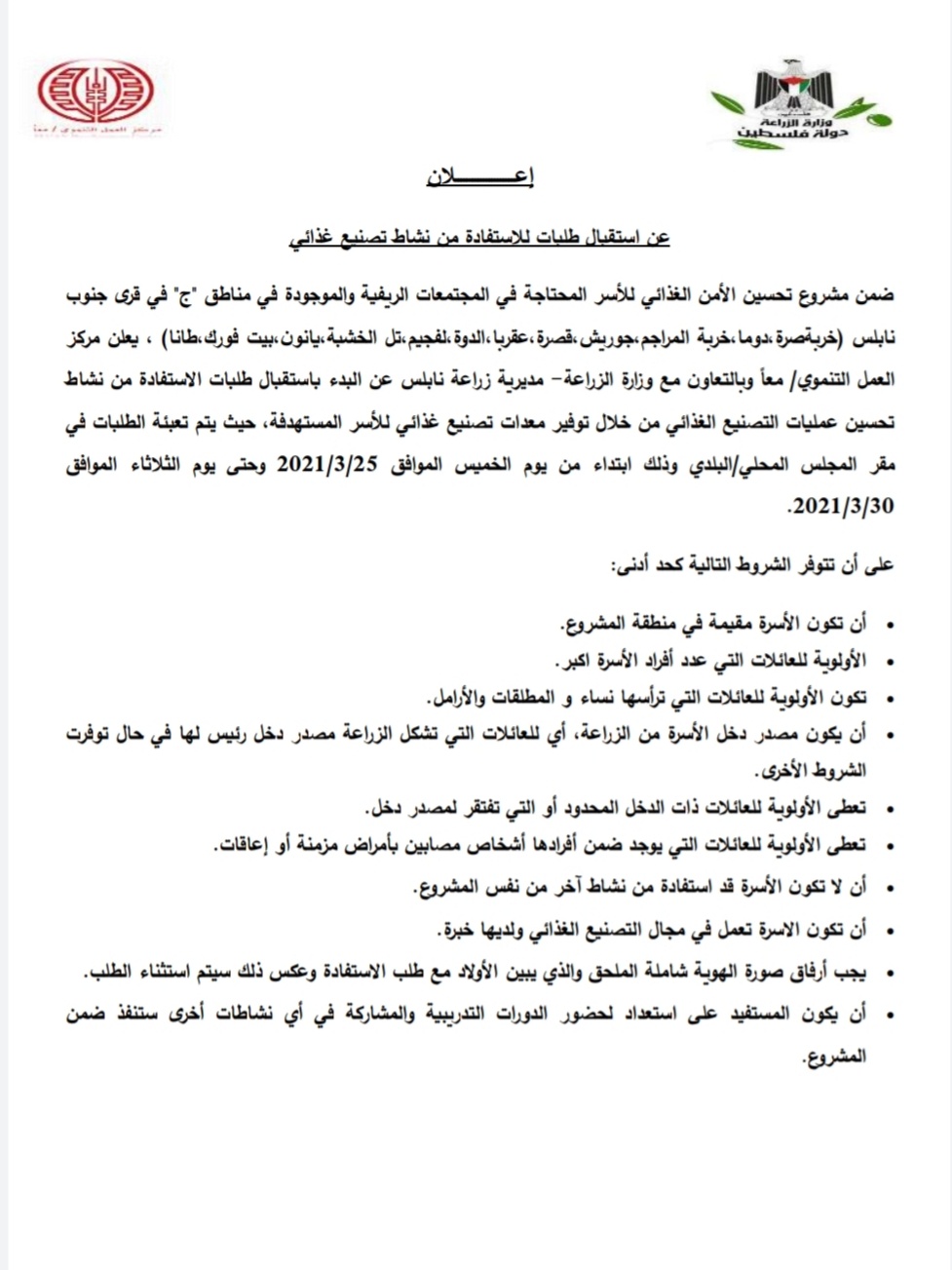 يعلن مركز العمل التنموي/ معا وبالتعاون مع مديرية زراعة نابلس عن البدء باستقبال طلبات الاستفادة…