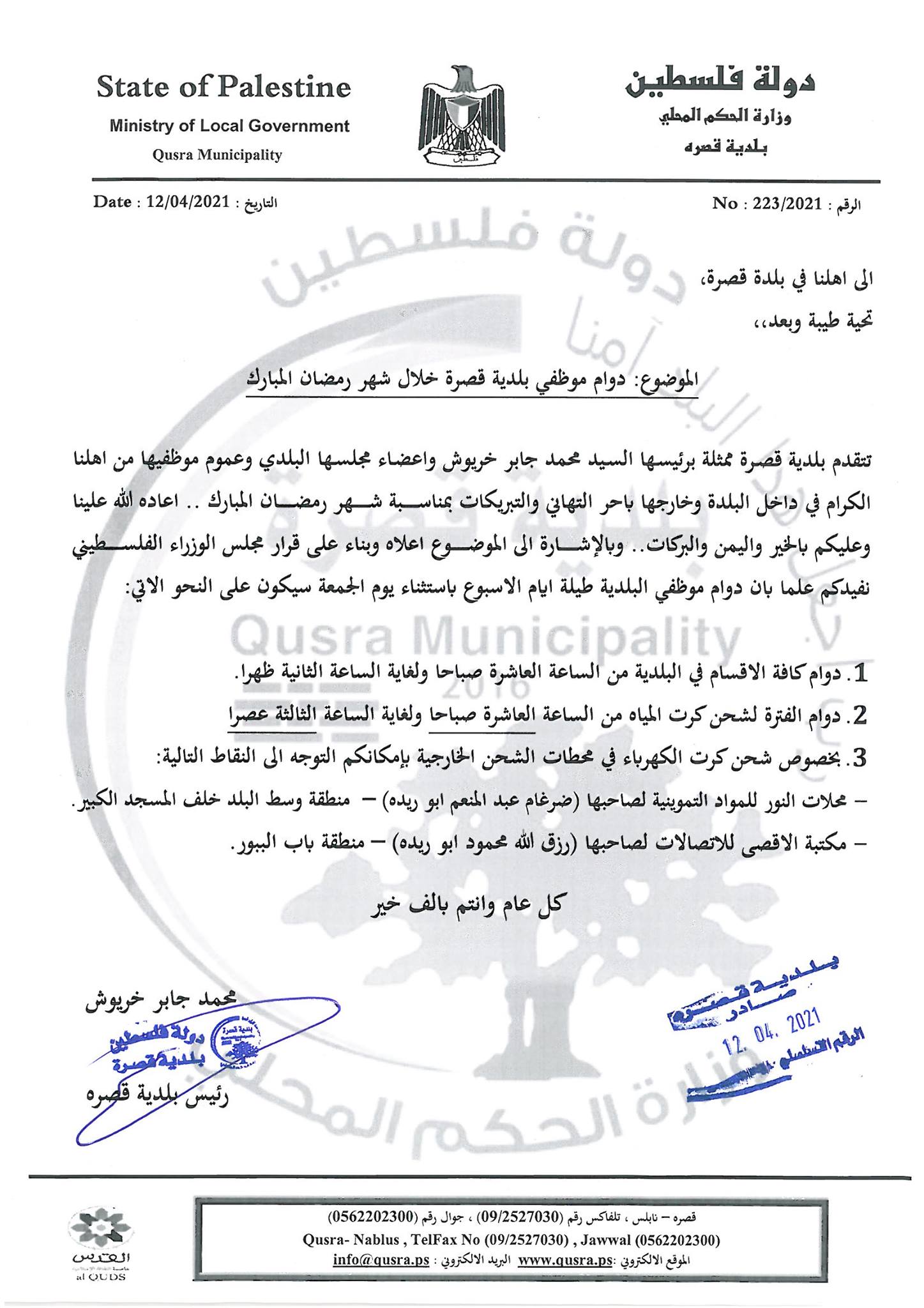 دوام موظفي بلدية قصرة خلال #شهر_رمضان_المبارك .. كل عام وانتم بالف خير