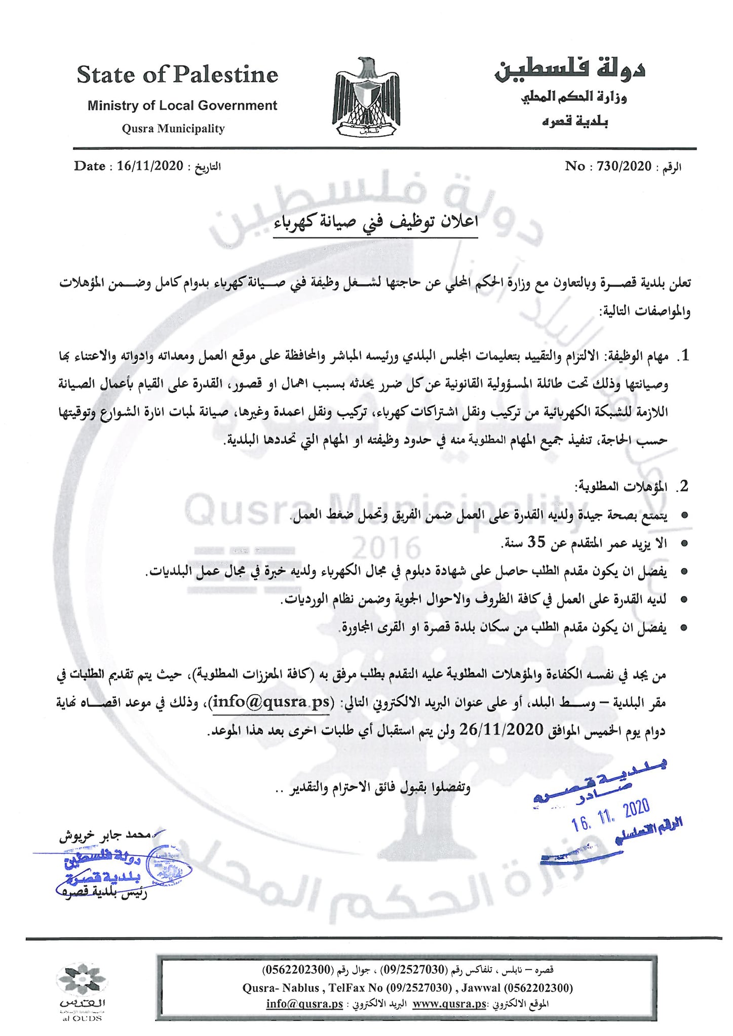 #إعلان_توظيف تعلن بلدية قصرة وبالتعاون مع وزارة الحكم المحلي عن حاجتها لشغل وظيفة #فني_صيانة_كهرباء حسب…