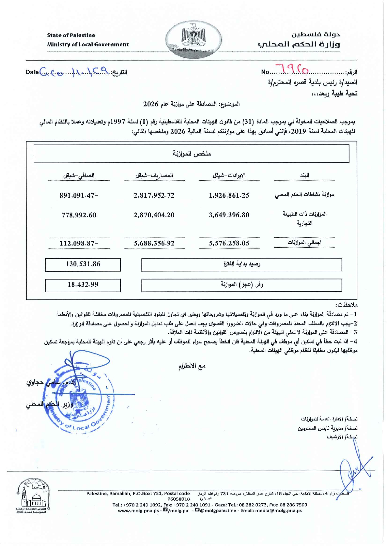 المصادقة على موازنة بلدية قصرة لسنة 2026