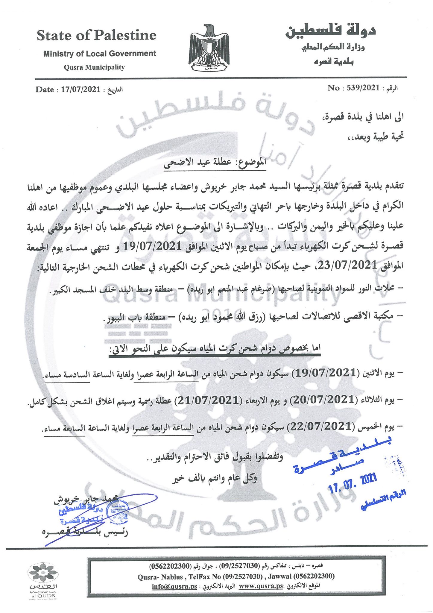 عطلة عيد الاضحى المبارك لموظفي بلدية قصرة 2021